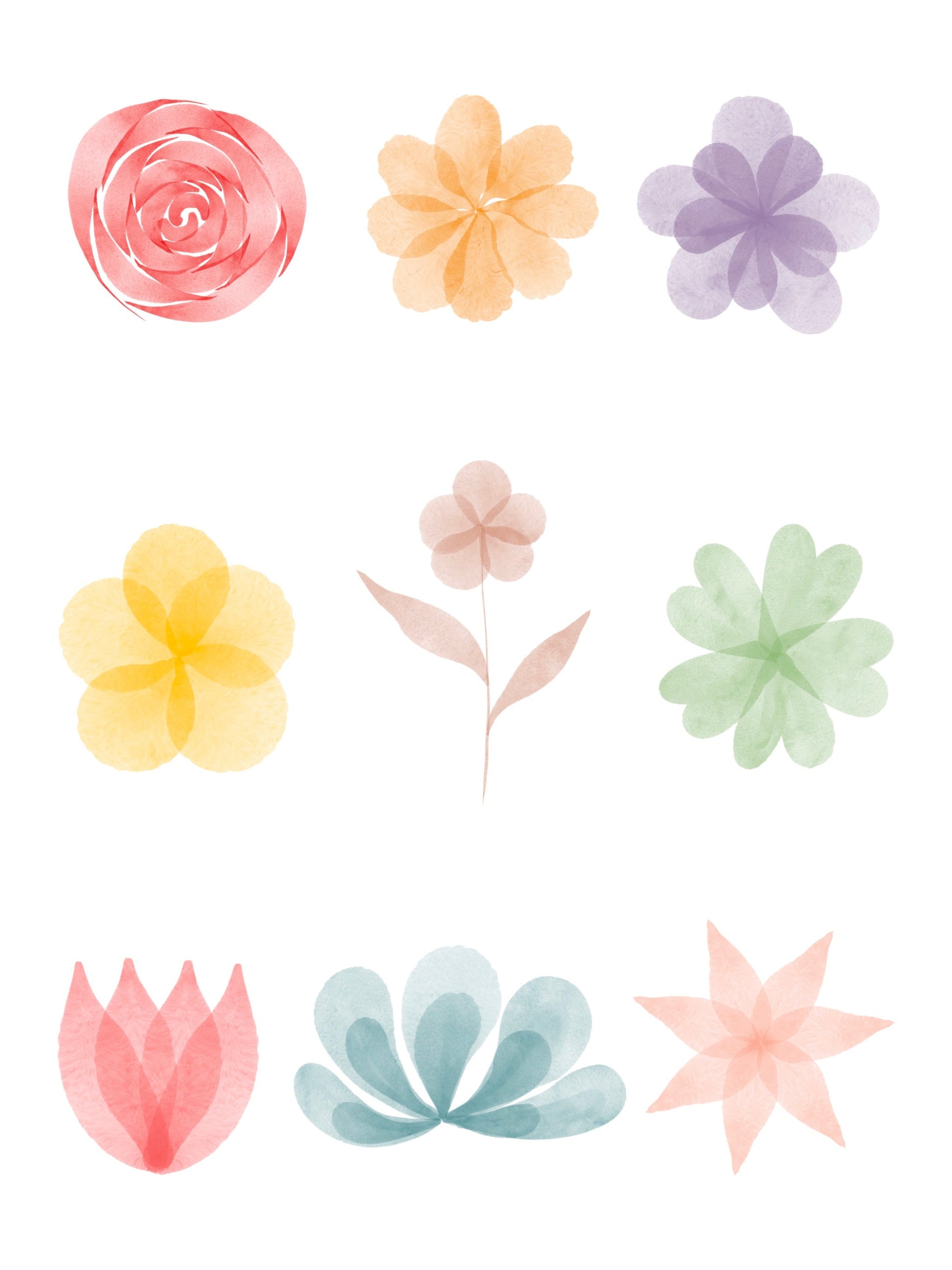 This is my brushset full of floral watercolor stamp brushes! It includes 15 different shapes that you can stamp in any color! With 9 flowers and 6 leafy shapes, you'll be able to make the perfect bouquet, or add the most elegant details to your design! However, this brush set is for PERSONAL USE ONLY. Please do not use theses brushes in commercial products, or products and projects that you will make a profit from.